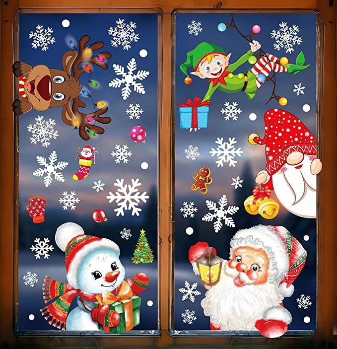 350PCS Christmas Decorations Snowflakes Window Clings Vintage Xmas Winter Decals Santa Clause Gnome Elf Snowman Reindeer Party Cling Decor