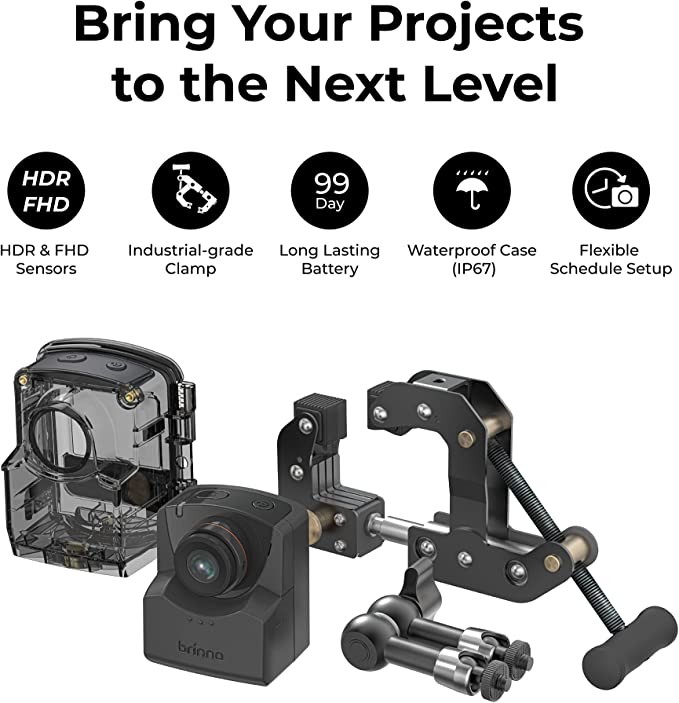 Brinno TLC2020 construction site bundled timing camera waterproof housing ATH1000 & fixed clip kit ACC1000P-HDR and FHD durable battery, rugged stainless steel, 360-degree rotatable tripod arm