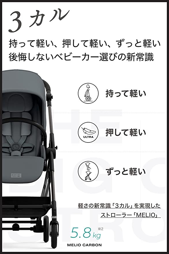 • [Easy to carry] Its weight is only 5.8 kg (MELIO CARBON), which is very outstanding in the history of CYBEX brand. It's so light that it can be folded and taken with you, even when going up and down stairs. It can also be easily tucked into a car.