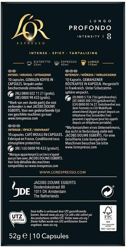 L'OR Coffee Capsules Lungo Profondo, 100 Nespresso® Compatible Capsules, 10 Pack, 10 x 10 Servings