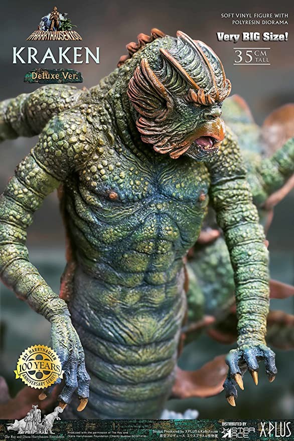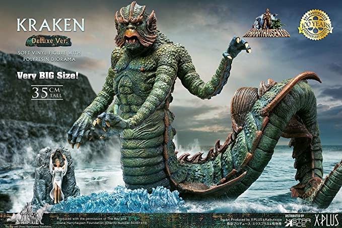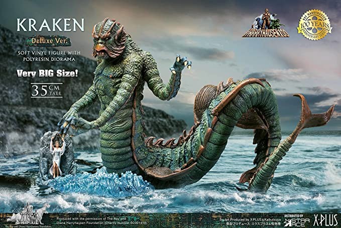Perhaps Ray Harryhausen's greatest achievement in stop-motion animation, Kraken is a massive four-armed creature with a long tail and a terrifying face. Ray Harryhausen Kraken's Super Vinyl Statue is the largest creation in Star Ace history! Standing nearly 14 inches tall and extending 21 inches, this impressive monster will be a beautiful display for any collection Taste. Traditionally sculpted by artisans at the renowned bio-shop in Kaibutsuya, the statue is made of soft vinyl and hand painted to highlight the sculptural details. The deluxe version of Kraken comes with a resin diorama base, sculpted ocean waves and a passive princess waiting to be rescued. This extended version is 25 inches long.