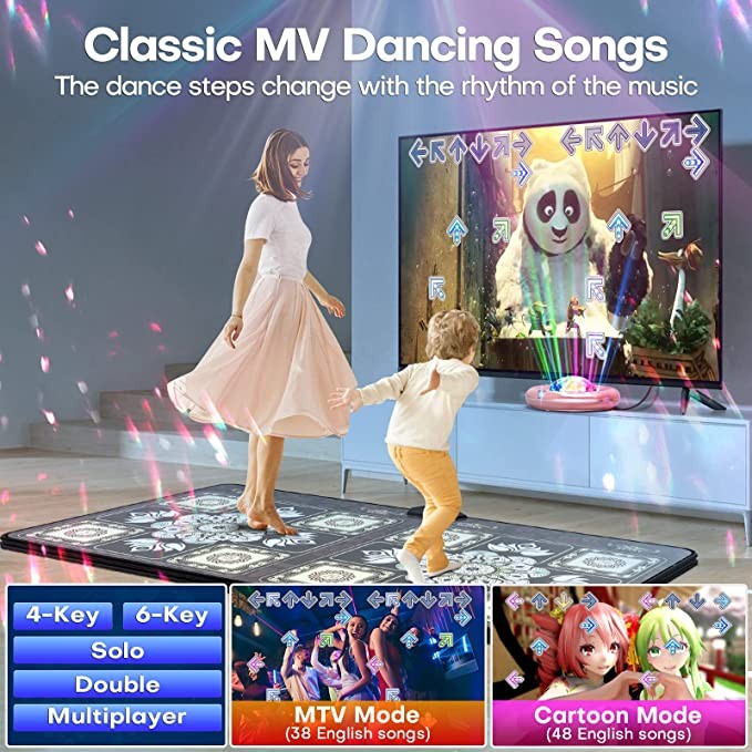 【HIGH QUALITY SAFETY & EASY INSTALLATION】Device installation just use HDMI to connect the host and TV, very convenient. PU+EVA high quality non-polluting and harmless material is harmless to human body. The anti-skid design of rubber particles on the bottom of the dancing mat makes it more secure. If you have any questions about our dance mats, please feel free to contact us via Amazon message and we will reply immediately.
