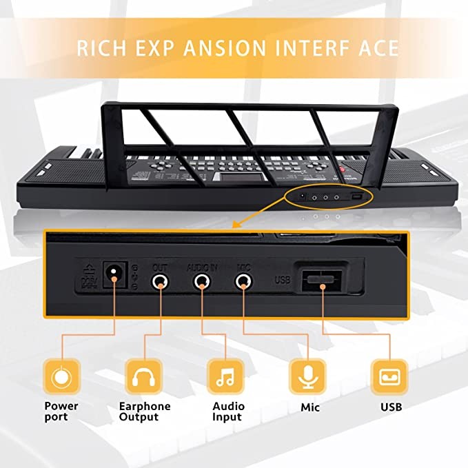 • SEIF-PLAY AND SINGING: The piano keyboard has built-in dual speakers, the clear sound quality helps to find the rhythm of music creation, supports the microphone input function, (the two ends of the box are microphone and power) let you record songs while playing, experience the self- play and sing. The key is designed with rebound force feedback, the touch is realistic, and the key strength is moderate, which is suitable for beginners to practice for a long time.