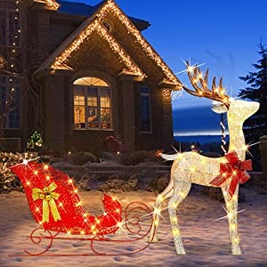 Zcaukya Christmas Yard Decoration, 4 FT 120 LEDs Pre-lit 3D Reindeer & Sleigh Outdoor Decorations, Warm White Light Up Glittered Standing Ornaments for Xmas Garden Patio Lawn Front Door Display